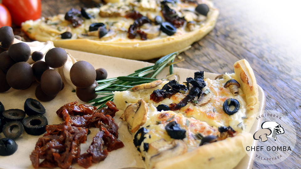 Spread the dough with sour cream and sprinkle with grated cheese and the ham previously chopped into squares, along with chopped scallions, raw champignon mushrooms and poplar mushrooms cut into small pieces, olives and a sprinkle of rosemary on top.