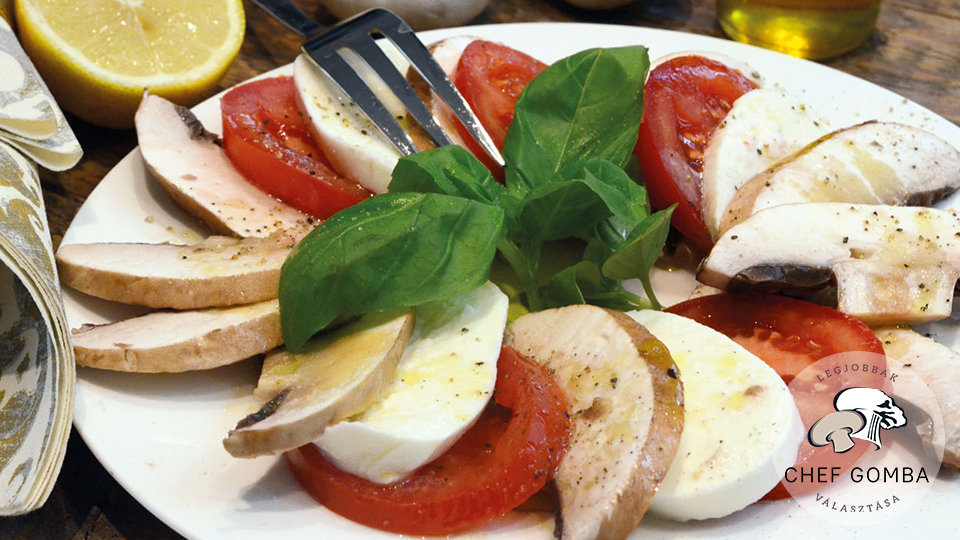 A nyers Portobello gombát, a mozzarellát és a paradicsomot felszeleteljük és váltakozva, kör alakban egy tányérra tesszük.